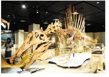 据美国《科学》杂志报道,根据有关化石分析得出的证据,埃及棘龙可能是地球上第一种半水栖的恐龙,它的体形长达15米,比此前记录的体形最大的恐龙霸王龙还要长近3米,且游泳能力强,绝大部分时间生活在水中,以巨鲨、锯鳐和肺鱼为食,是迄今发现的唯一能够适应水中生存的恐龙。 新华社记者 鲍丹丹 摄