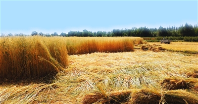 图为郭勒木德镇中村收割场景。 记者 宗布尔 摄