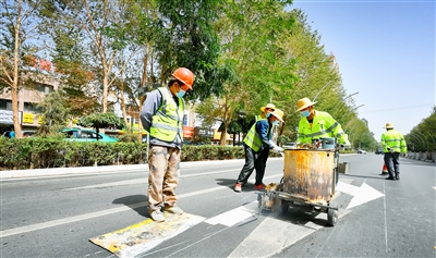 日前,记者在柴达木路看到,工作人员正在对道路标线进行刷新。眼下,创城各项工作正在如火如荼地进行,市交通部门在完成道路斑马线刷新工作后,现对各道路交通标识、标线进行刷新喷涂作业,为市民创造安全有序的交通环境。记者 冯春梓 摄