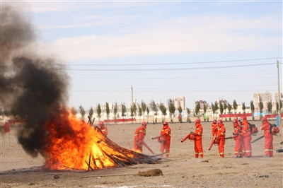本次演练分集合整队、现场扑火、撤离火场和清点人员、扑火装备等四步。当演练总指挥下令演练开始后,由第一支灭火梯队迅速赶往火场投灭火弹,随后由后面四支灭火梯队利用风力灭火器、灭火水枪、铁锹、消防车等五种扑火装置轮流作业,迅速将火扑灭。扑救人员安全撤离。