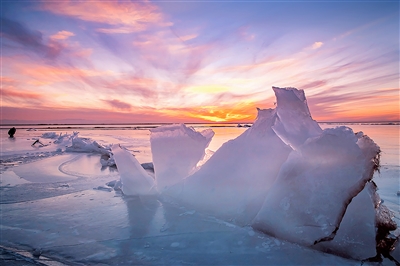 寒冬时节,夕阳下,察尔汗盐湖一处淡水湖冰封的水面呈现异样的美。