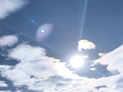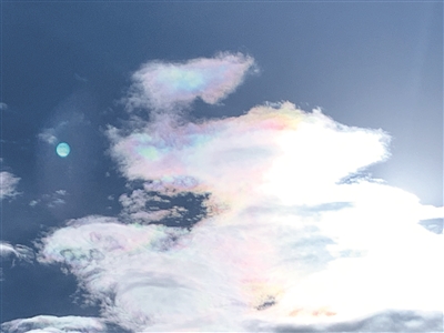 当时天气晴好,记者看到,天空中太阳周边的云彩色彩斑斓。只见阳光投射在薄云上,薄云的四周都像是被赤橙黄绿青蓝紫的色彩镶了边,不断渐变幻化成不一样的形状,七彩祥云奇观呈现了近二十分钟,让人赞叹不已。