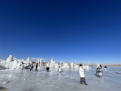 走进金鱼湖草原,首先映入眼帘的是冰雕群,晶莹剔透的冰雕伫立在无水的湖中央,仿佛一座小型冰山,令游客兴奋不已。