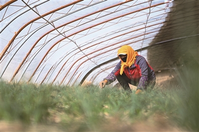 3月23日,药农在青海省海西蒙古族藏族自治州德令哈市柯鲁柯镇的藏红花大棚内除草。
