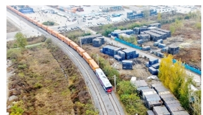 ◀中国郑州至芬兰赫尔辛基的中欧班列驶出中国铁路郑州局集团有限公司圃田车站(2020年11月20日,无人机照片)。 新华社记者 郝源 摄