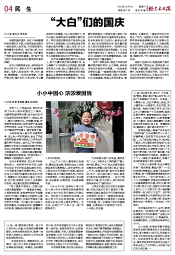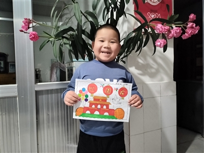 在牛牛和嘟嘟家,因为孩子年龄都比较小。妈妈用手中的卡纸,边制作边向孩子们讲述五星红旗的来历。牛牛和嘟嘟闪着大眼睛听得入了神。正在上大班的张富琛在妈妈的引导下,稚嫩的小手在画纸上画出了牡丹花、红灯笼、宇航员、天安门,五彩缤纷的色彩,表达着对祖国的深情祝福。