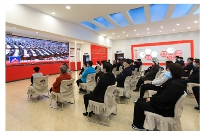 10月16日,在辽宁省沈阳市皇姑区三台子街道牡丹社区党群服务中心,居民和沈阳市皇姑区航空实验小学的少先队员收看中国共产党第二十次全国代表大会开幕会。