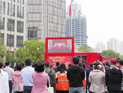 波光粼粼的东湖之滨,湖北武汉东湖新城社区党员群众服务中心摆上了长凳,大伙围聚一堂,集体收看党的二十大开幕会直播。一阵阵热烈的掌声,不时在现场响起。