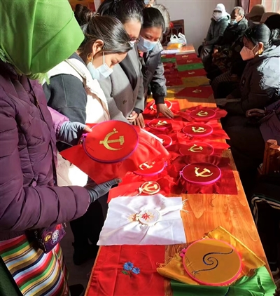 党旗、手提包、枕套等一件件精美的刺绣手工艺品摆放在桌子上,学员们围坐在一起相互探讨,相互交流……