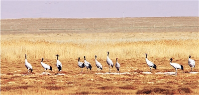 近日,德令哈市马兰滩附近,一群黑颈鹤翩然而至,优雅的身姿为冬日的柴达木平添了几分美感。它们时而在蓝天飞翔、时而在草滩漫步,让摄影者感受到了大自然的生态美。