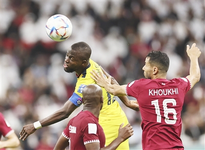 当日,在海湾球场举行的2022年卡塔尔世界杯揭幕战中,厄瓜多尔队以2比0战胜东道主卡塔尔队,恩纳·瓦伦西亚在本场比赛中独中两元。 新华社记者 兰红光 摄