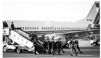 15时55分,载护江泽民同志遗体的专机缓缓降落。在低回的哀乐声中,12名礼兵抬护安放着江泽民同志遗体的灵柩,缓缓走下专机,行进至迎灵队伍正前方肃立。习近平等向江泽民同志遗体三鞠躬,目送灵柩上灵车。之后,治丧委员会办公室成员和江泽民同志亲属护送遗体前往停灵处。
