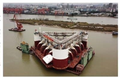 当日,兆瓦级漂浮式波浪能发电装置在广东东莞开展下水调试。该装置平面面积超3500平方米,包括了发电平台、液压系统、发电系统、监控系统、锚泊系统等部件,通过三级能量转换将波浪能变成绿色电能,在满负荷的条件下,每天可产生2.4万度电。 新华社记者 黄国保 摄