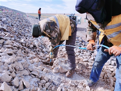 来到曲吾站区间,远远看到有一群人围在高路基旁安装着什么,白耀元走近好奇地询问,一名施工负责人笑着说:“我们正在给高海拔路基量体温嘞!”“量体温?路基也要量体温?难道他们在路基旁埋设的这个铁棒是体温计?”他顿时心中充满了十万个为什么。紧接着李来强副主任一边现场查看着施工情况,一边介绍:“这根铁棒叫热棒,现在职工人员正在新增地温监测断面,就相当于给路基‘量体温’。”