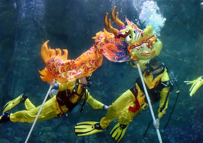 春节临近,青岛极地海洋公园在春节期间推出了“海底舞龙”和水下拜年等贺新春活动,迎接农历新年的到来。 新华社记者 李紫恒 摄