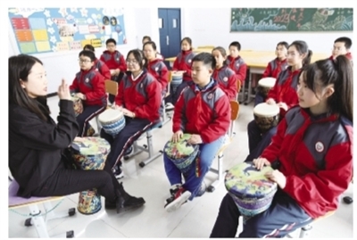 2月14日,在承德市双桥区石洞子沟小学,学生在老师的指导下练习非洲鼓。