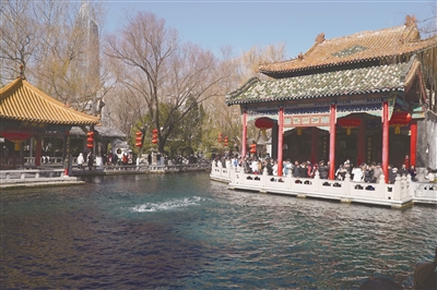 2月14日,山东省济南市天下第一泉风景区,游客在趵突泉游览。新华社记者 徐速绘 摄