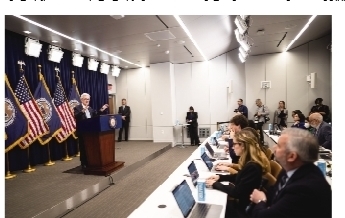 3月22日,美国联邦储备委员会主席鲍威尔(左一)在华盛顿出席新闻发布会。