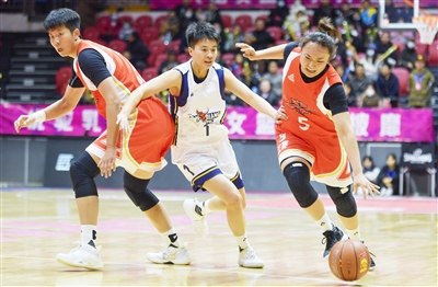12月7日,武汉盛帆白鹤队球员丁弈可(右)在比赛中突破。