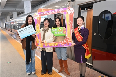 1月10日,在杭州西站,旅客与乘务员在杭州西站直达广州东站G3073次高铁列车发车前合影。
