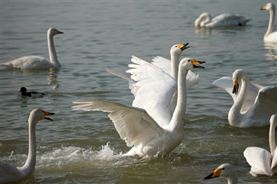 1月9日,白天鹅在山西平陆黄河湿地嬉戏。