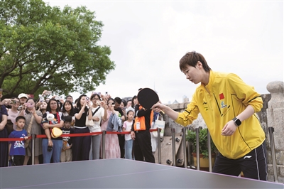 4月20日,中国乒乓球运动员王曼昱(前)在活动中。