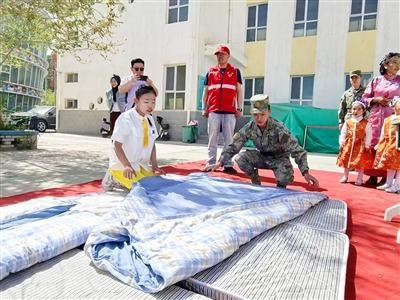 随后,进行了一场别开生面的“成长课堂”——生活技能展示。对于特校的孩子们来说,每一项看似简单的技能,都凝聚着无数次练习的汗水。部队官兵为特校孩子带来内务整理展示,手把手教孩子们叠“豆腐块”被子,互动环节温情满溢。