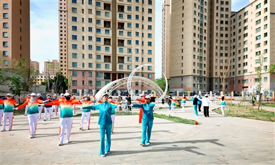 6月2日,柴达木西路的小游园内,市民正在跳节奏欢快的健身操。