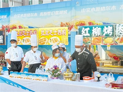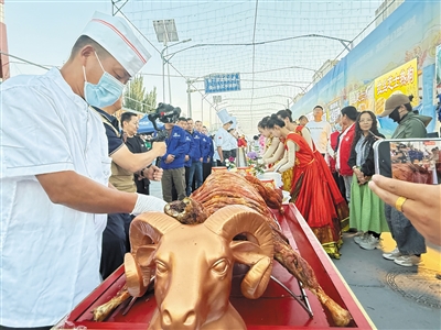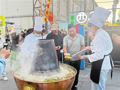 “神秘盲盒”环节亮点十足,一口直径1.2米的铜火锅惊艳亮相,热气腾腾的汤底香气浓郁,吸引食客围坐品尝,大家共享高原风味、畅聊旅途见闻,美食成为连接彼此的桥梁。“能作为商户代表参与特别荣幸!”青海原味土火锅店负责人张鑫说,此次带来了土火锅、炕锅、烤全羊等本地特色美食,长桌宴一开,美食很快就一抢而空,现场群众热情高涨。
