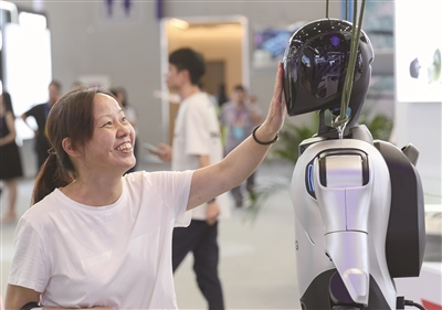 9月5日,观众在智博会现场触摸人形机器人。 新华社记者 陈诚 摄