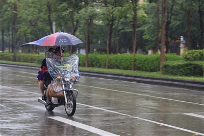 9月8日,市民在广东阳江市区冒雨骑行。