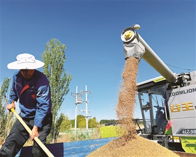 在郭勒木德镇红柳村仁达合作社的麦田里,连绵的金色麦浪随风起伏,一派丰收景象。合作社社员苏生英驾驶着收割机穿梭其间。机械轰鸣声中,饱满的麦粒如流水般从出粮口涌入运输车。“今年雨水充沛、高原日照充足,小麦长势比去年还好,麦粒特别饱满。”苏生英笑着说,今年合作社种了100亩小麦,预计亩产可达800斤,靠着人机协作、收运衔接,两天就能完成全部收割任务。
