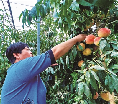 尝到了种植水蜜桃的“甜头”,岳梅芳两口子对果树种植更有干劲了。如今他们的大棚里,水蜜桃、葡萄、梨、红枣等也即将迎来丰收。“目前主要靠顾客上门采摘,这样能保证水果自然成熟。除了桃子,其他品种我们也在试种,不断扩大品种试种范围。”岳梅芳说。