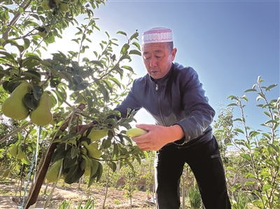 从2001年起,马艾洒先后尝试过种蔬菜、种杏子、养牛羊,在产业发展中不断摸索。正是这份乐于学习、勇于尝试的劲头,让他在香蕉梨种植上找到了致富新路径。“我种了三亩多香蕉梨,今年一亩地能产4000多斤,比去年增产不少,三亩地算下来能收入3万多元。”说起今年的收成,马艾洒底气十足。