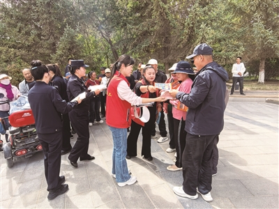 本报讯(记者 段亚慧)近日,园林社区联合金峰路派出所在昆仑广场开展以“筑牢反诈防线,守护群众钱袋”为主题的防范电信网络诈骗专项宣传活动,将反诈知识送到居民“家门口”。