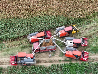 9月21日,收割机卸下收割的高粱(无人机照片)。