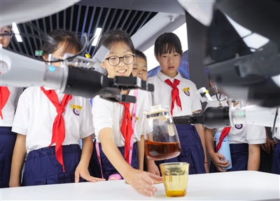 9月23日,前来参观的上虞区阳光小学的学生参与扰动实验,让机器人自己寻找杯子倒茶。