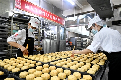 目前,各地加紧制作月饼,供应中秋节日市场。