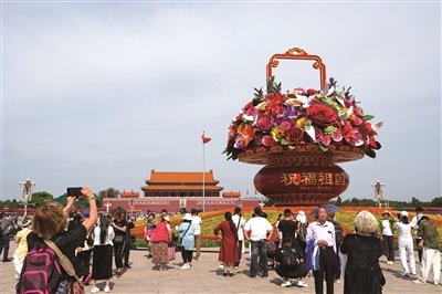 游客在天安门广场观赏“祝福祖国”大花篮(9月25日摄)。