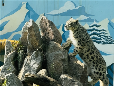 被救护的雪豹“凌小芒”在西宁野生动物园雪豹馆的假山上玩耍。 新华社记者 李宁 摄