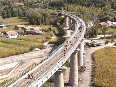 9月28日,工人在京通铁路河北隆化段施工(无人机照片)。