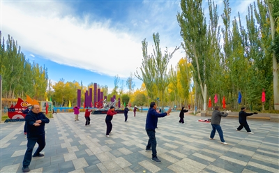 10月9日清晨,市民们在儿童公园迎着朝阳晨练。