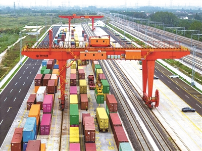 图为10月13日,在江苏省扬州市江都商贸物流园铁路物流基地,大型起重设备在起吊集装箱,这些集装箱将通过海铁联运列车发往上海芦潮港准备出口(无人机照片)。新华社发 (任飞 摄)