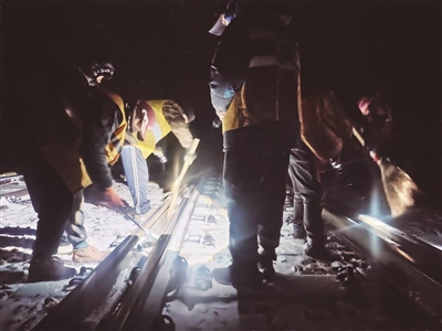 说话间,望昆站线路上橙黄色工务服在手电闪烁下连成跃动的光带,叮叮当当的除雪声划破了夜空。