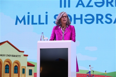 10月15日,联合国副秘书长、联合国人类住区规划署(人居署)执行主任罗斯巴赫在阿塞拜疆汉肯德举行的第三届阿塞拜疆国家城市论坛开幕式上致辞。