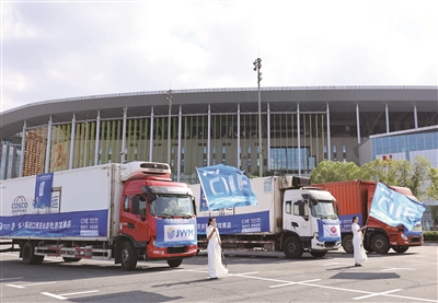 10月23日,在第八届进博会首批展品进馆仪式现场,装载展品的卡车停在国家会展中心(上海)北广场。