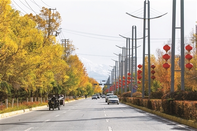 秋日的格尔木,雪山与城市楼宇相映,街道林木金黄,湖畔芦苇摇曳,尽显高原秋韵。 记者 马俊杰 摄
