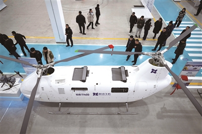 10月30日,在哈尔滨市平房区的哈尔滨联合飞机科技有限公司生产厂区,参会人员参观T1400无人直升机。
