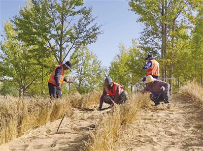 在察汗乌苏河流域防沙工程区,治沙专家与工作人员往来忙碌,整齐排列的防沙草方格如列队士兵守护着沙区。通过专业培训,周边村民纷纷加入治沙队伍,从“旁观者”变身“参与者”。“以前觉得治沙是政府的事,现在亲自参与其中,看着沙子变绿地还能增收,打心底里愿意干。”务工人员张祯一边熟练地将稻草压进沙中夯实,一边笑着说,农闲时在家门口打工,月收入能有四五千块,不仅挣了钱,还学会了铺沙障、栽苗木的硬技术。如今,像张祯这样的普通农牧民,正逐步成长为懂技术、会操作的治沙“技术能手”。