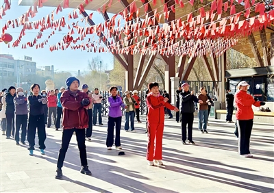 清晨,阳光初洒,各公园已陆续迎来健身爱好者。儿童公园的健身步道上,市民们或慢跑或快走,呼吸着清新空气;二十余位中老年人正随音乐节拍跳着健身操,动作整齐、精神饱满。铁园“口袋公园”的透水石砖路上,老人们在健身器材上踢腿扭腰,孩子们在一旁嬉戏,这里完善的设施让居民实现“步行几分钟即达”的锻炼需求。中心广场小游园里,健身爱好者跳着欢快的扇子舞,成为冬日晨曦中的一抹亮色。“冬天待在室内容易犯困,每天来公园跑两圈,不仅身体暖和,工作也更有精神。”常来锻炼的市民王军说。